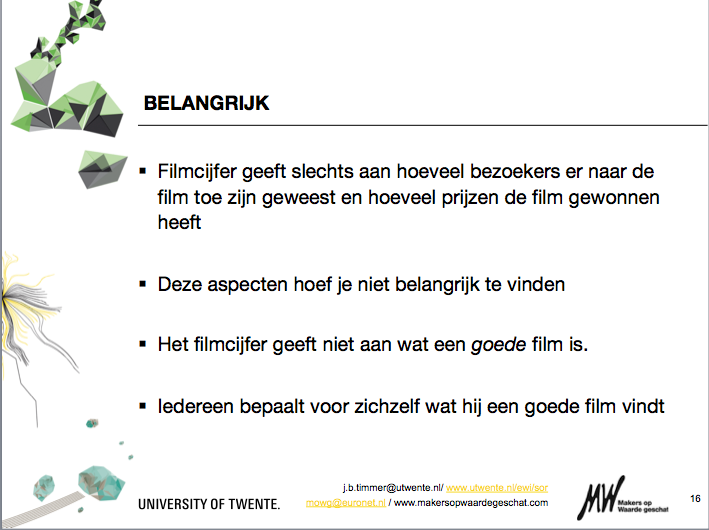 WELKOM ! op de presentatie van het wetenschappelijk artikel van Universiteit Twente met als conclusie de staat van dienst van het filmteam is graadmeter voor succes van de flim.